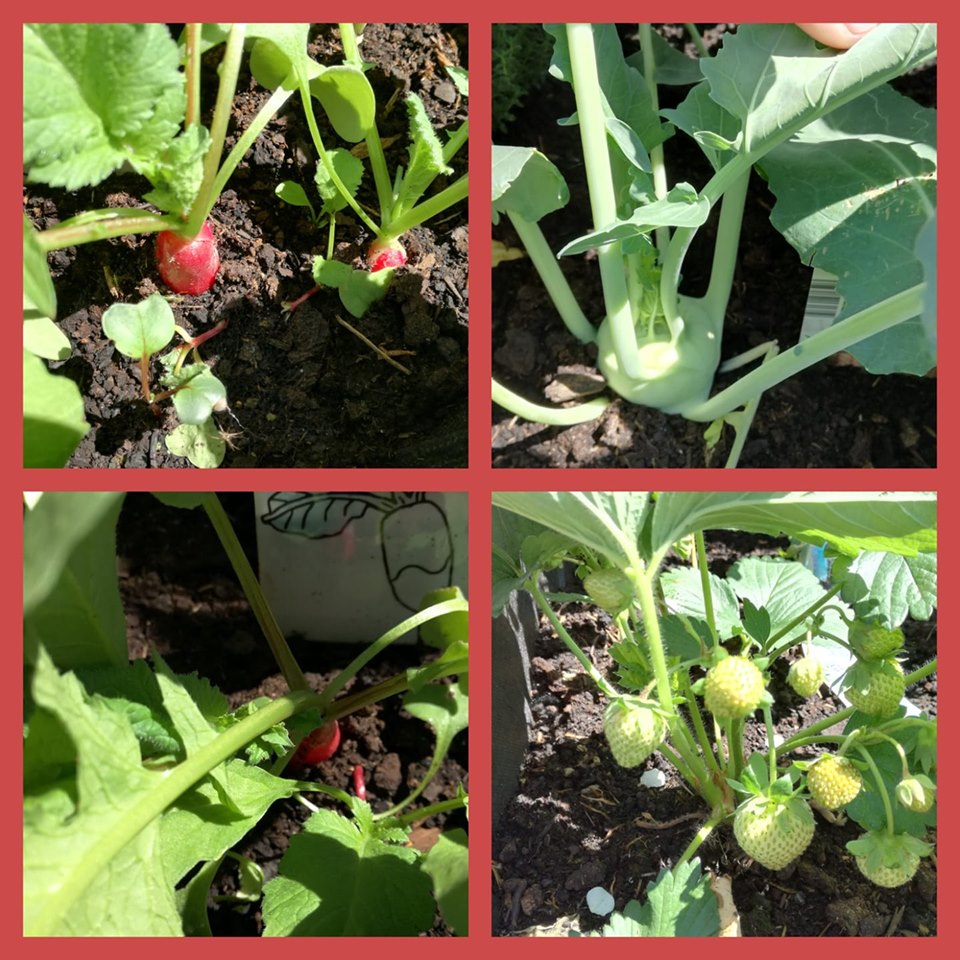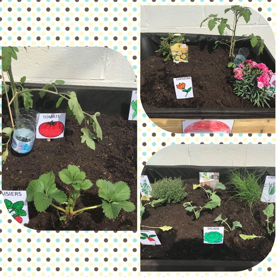 Après avoir planté de la ciboulette, du thym, des tomates et des fraisiers, nous avons semé des radis, de la salade, des haricots, capucine et soucis.