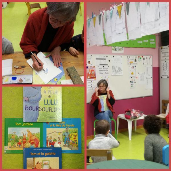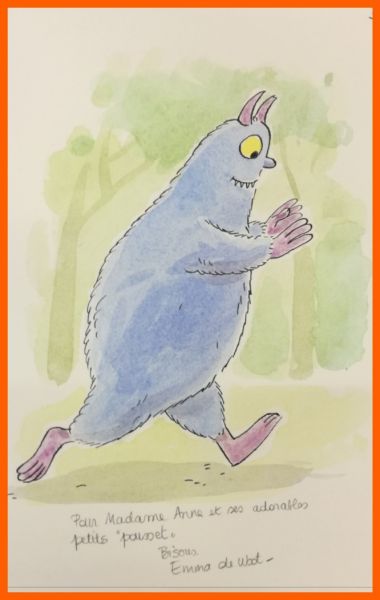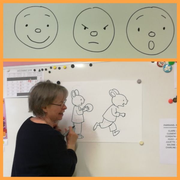 Nous avons eu la joie d’accueillir Marie-Aline Bawin alias Emma de Woot en classe. Elle nous a parlé de son métier d’illustratrice de livres pour enfants, de ses personnages Tom et Lulu Boursouflu, d’esquisses et de la technique de dessin à l’aquarelle et encre de Chine. Nous avons découvert comment représenter les émotions et les postures par le dessin : de face, de dos, de profil gauche et droit. Puis, nous nous sommes entraînés sous son œil bienveillant. Nous gardons le souvenir d’une rencontre chargée d’émotion et de plaisir partagé avec beaucoup de « Oh … comme c’est beau »