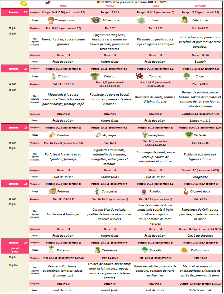 Repas chauds: (comprend: potage/repas/dessert) En maternelle : 3,90 € / En primaire : 4,50€ / Potage : 0,50 € (maternelle et primaire) Reprise des repas et des soupes dès le lundi 26 août 2024